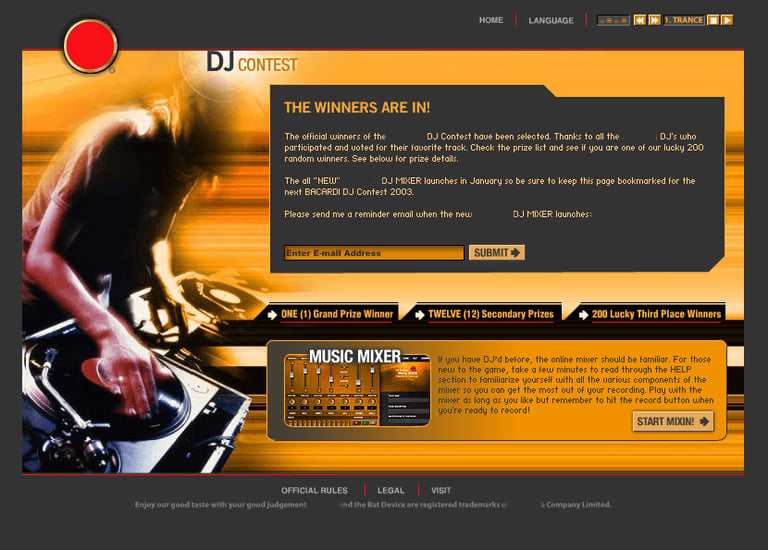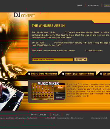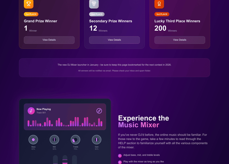 Revamped this competition website to prominently showcase the official victors of the DJ Contest while enhancing content hierarchy, readability, and overall visual appeal. The refreshed design aims to convey a celebratory and professional atmosphere for announcements while also recognizing and appreciating all participating DJs and voters with a more engaging and user-friendly layout.